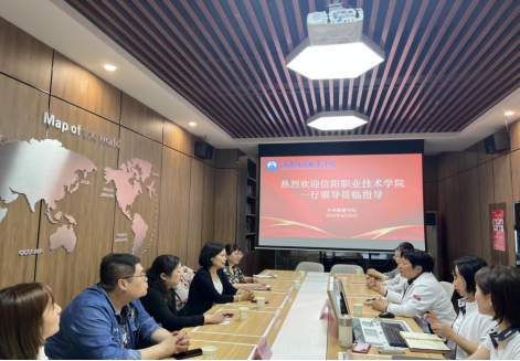 4月20日,太阳成集团tyc33455刘晓鹂院长、副院长刘文敏一行4人来到河南经贸职业学院外语旅游学院参观交流,外语旅游学院院长王君华, 副院长邓晓婷、何珊及相关负责人参与交流与座谈。
