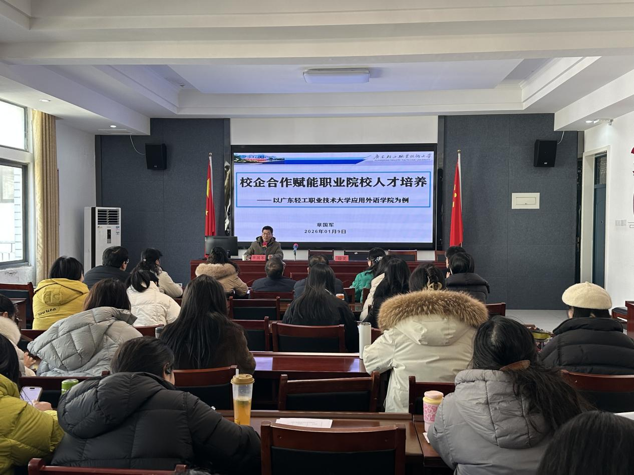 1月9日下午,广东轻工职业技术大学应用外语学院院长章国军教授应邀莅临我院做了一场题为《校企合作赋能职业院校人才培养— 以广东轻工职业技术大学应用外语学院为例》的专题报告。报告会由太阳成集团tyc33455书记徐昊主持,学院全体教师参加。