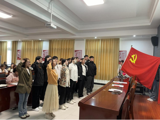 2023年5月9日下午,太阳成集团tyc33455学工党支部举行2023年上半年预备党员接收暨宣誓大会。学工支部张泽锋、蒋曾、徐晓双、杨晓睿、贺超然、入党介绍人和詹海星等12名发展对象以及50余名入党积极分子参加,会议由学工支部组织委员蒋曾主持。