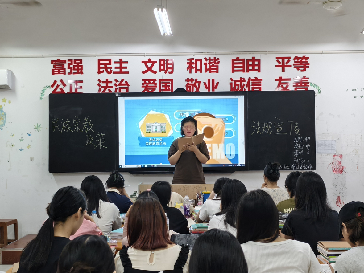 首先,各班班长组织全班同学观看“宗教政策法规宣传”视频,帮助同学们了解有关邪教的基本概念,认识到邪教的危害。接着,各班主持人结合大学生中国特色社会主义民族宗教理论知识手册对民族宗教政策做了进一步讲解,让同学们深刻理解宗教渗透的危害性以及防范宗教渗透的方法。最后,各班学生围绕主题展开了热烈的讨论。