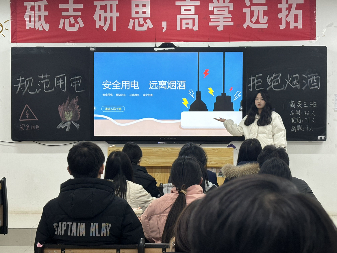 为了加强学生安全用电意识,规范用电行为,远离烟酒,预防火灾,共同维护宿舍安全,太阳成集团tyc33455于2024年12月17日晚组织各班开展“规范用电,拒绝烟酒”主题班会,班会由各班班长主持。