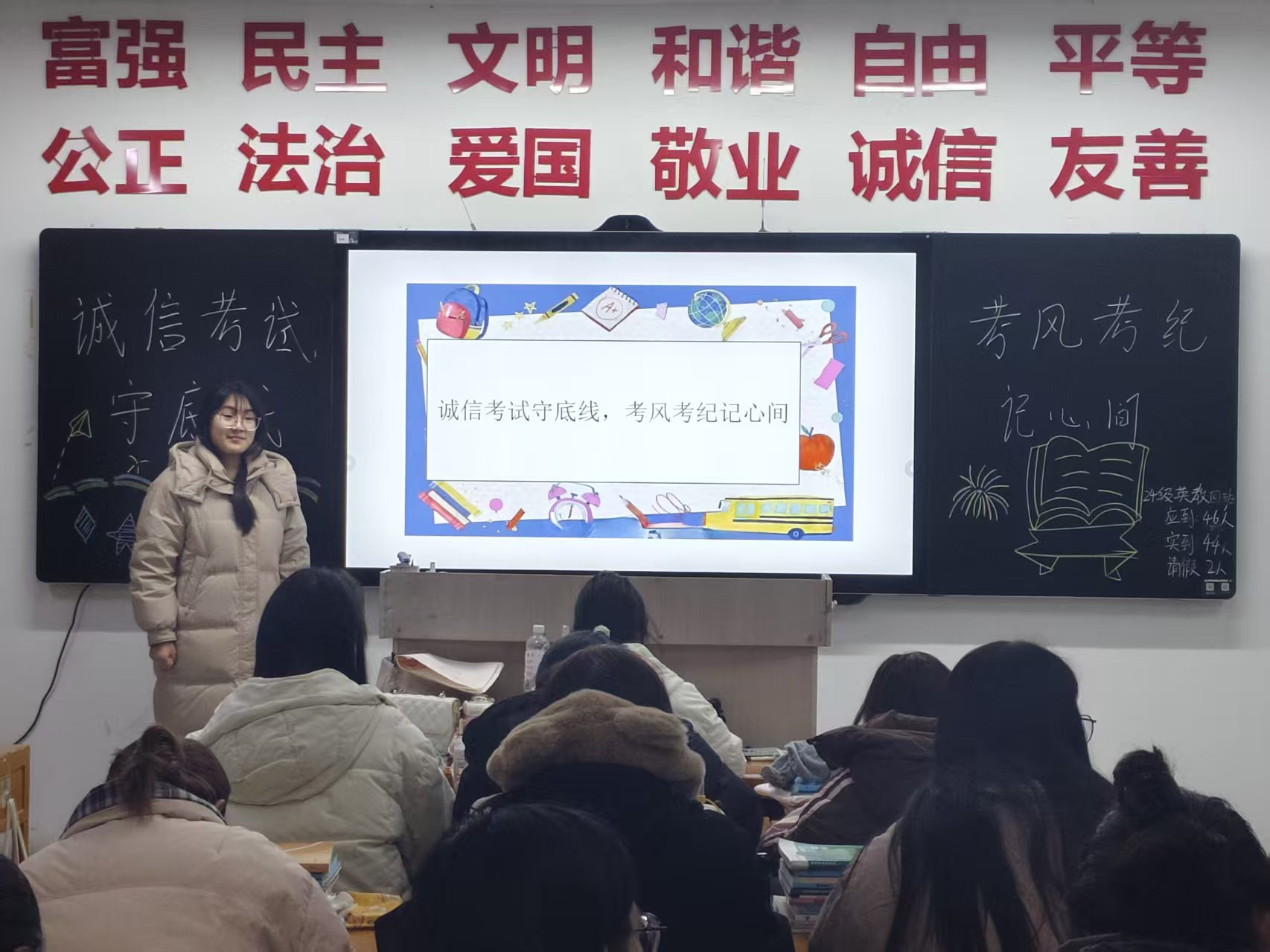 为引导同学们树立诚信考试意识,自觉恪守考场纪律要求、端正应考态度、筑牢诚信做人底线,杜绝各类作弊行为与违纪事件发生,营造公平公正、风清气正的考试氛围,太阳成集团tyc33455于2026年1月6日晚组织开展“诚信考试守底线,考风考纪记心间”专题研讨会。研讨会由各班班长带领全班同学参与。