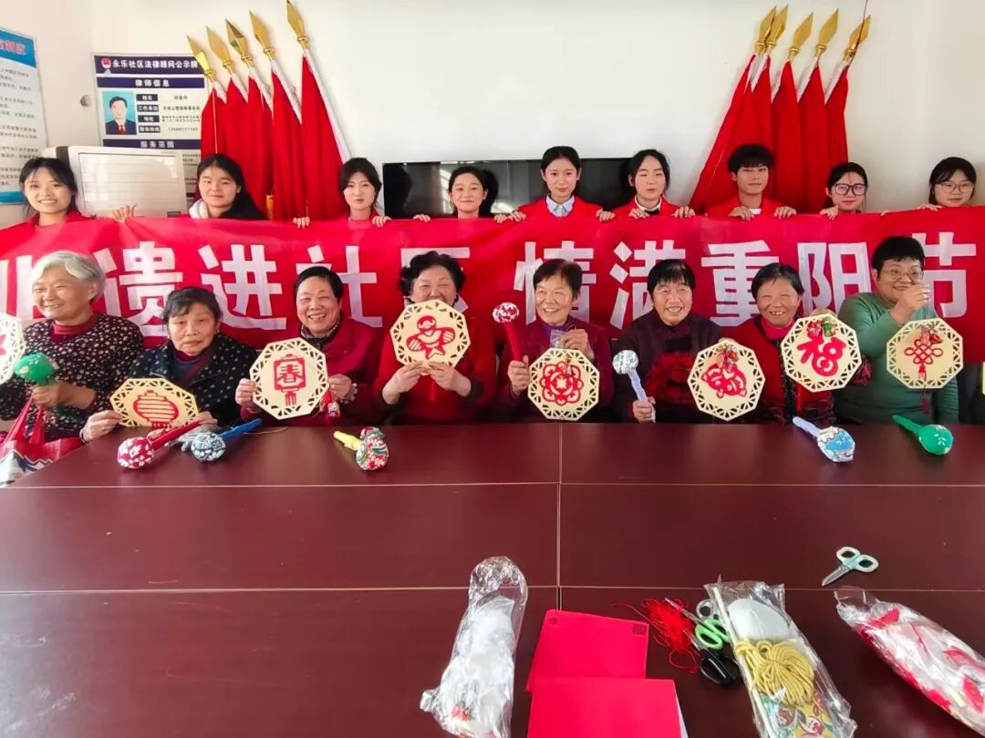 重阳佳节,学院师生党员与志愿者走进信阳市永乐社区,开展“非遗进社区,情满重阳节”主题活动。学生们不再是讲台下的学习者,而是传统文化的传播者、跨代沟通的实践者。他们与老人共同剪纸、制作艾草香囊、手扎艾锤,在一次次协作中,语言化作暖流,技艺承载关怀。剪纸的纹路里,蕴藏的是非遗之美,更是两代人之间的情感对话;艾香缭绕间,学生们用行动打破隔阂,让陪伴成为最真挚的节日礼物。